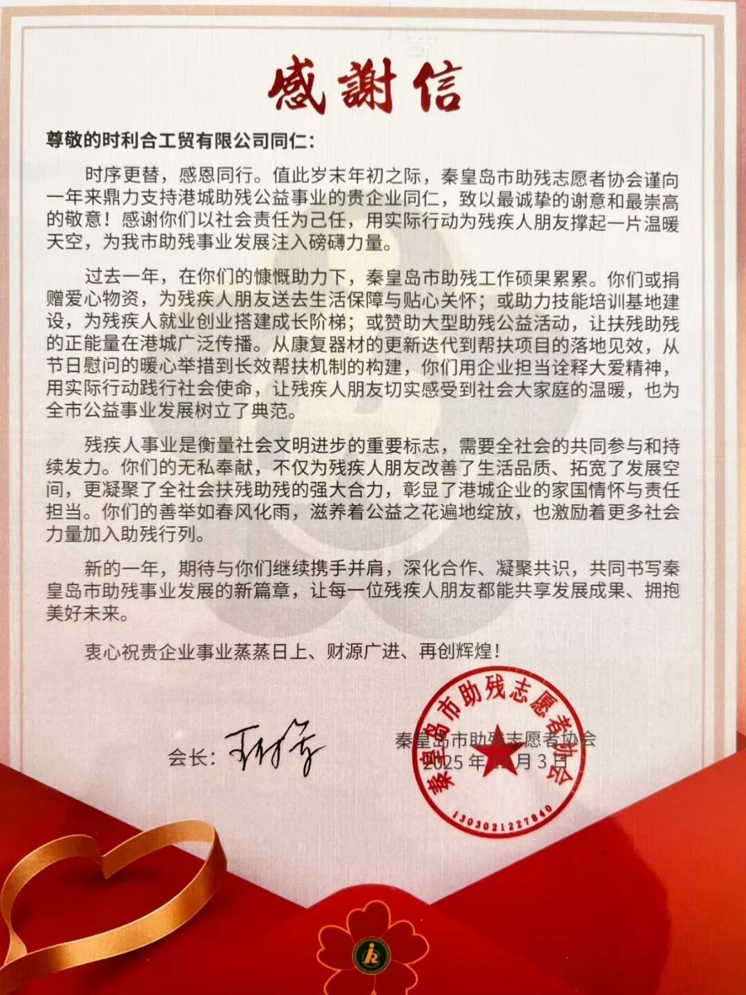 12月3日,秦皇島市“秦心共融 益起歡歌”世界殘疾人日公益聯歡會順利舉辦。我司董事長、秦皇島市助殘志愿者協會會長王付軍全程參與,和各界愛心人士一起為殘障群體發聲,助力助殘事業。
